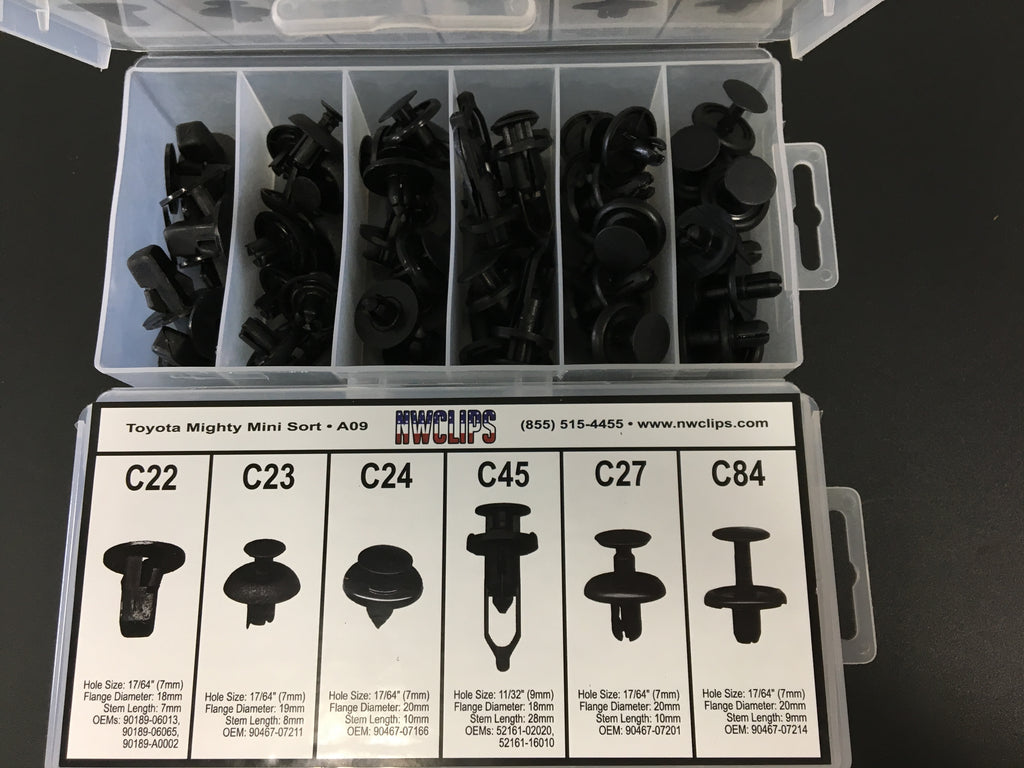 This mini kit is designed to fit in your glove box or trunk compartment and contains an excellent mix of clips used in one form or fashion on the most popular Toyota and Lexus models, especially the Corolla, Camry and Prius.